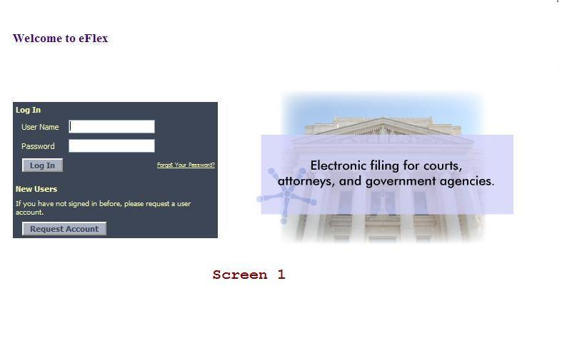 The first task in using the Court's eFlex efiling system is to open an account. Go to the web site where you see the login screen.