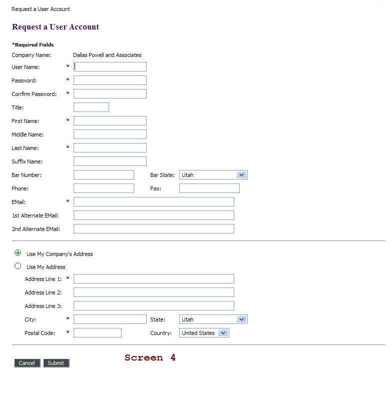 The pull-down option contains the organizations currently registered in eFlex. If your organization is not listed click the second radio button and type in your law firm's name and then click Submit.The next screen has several questions to fill out. The asterisk indicates the information is required. You may choose your own username and password. Each username must be unique. If the username is not unique when submitted you will be prompted to select a different username. Once completed, a request to approve your account will be given to the Administrator. As soon as the Administrator approves your account you will receive an email message.